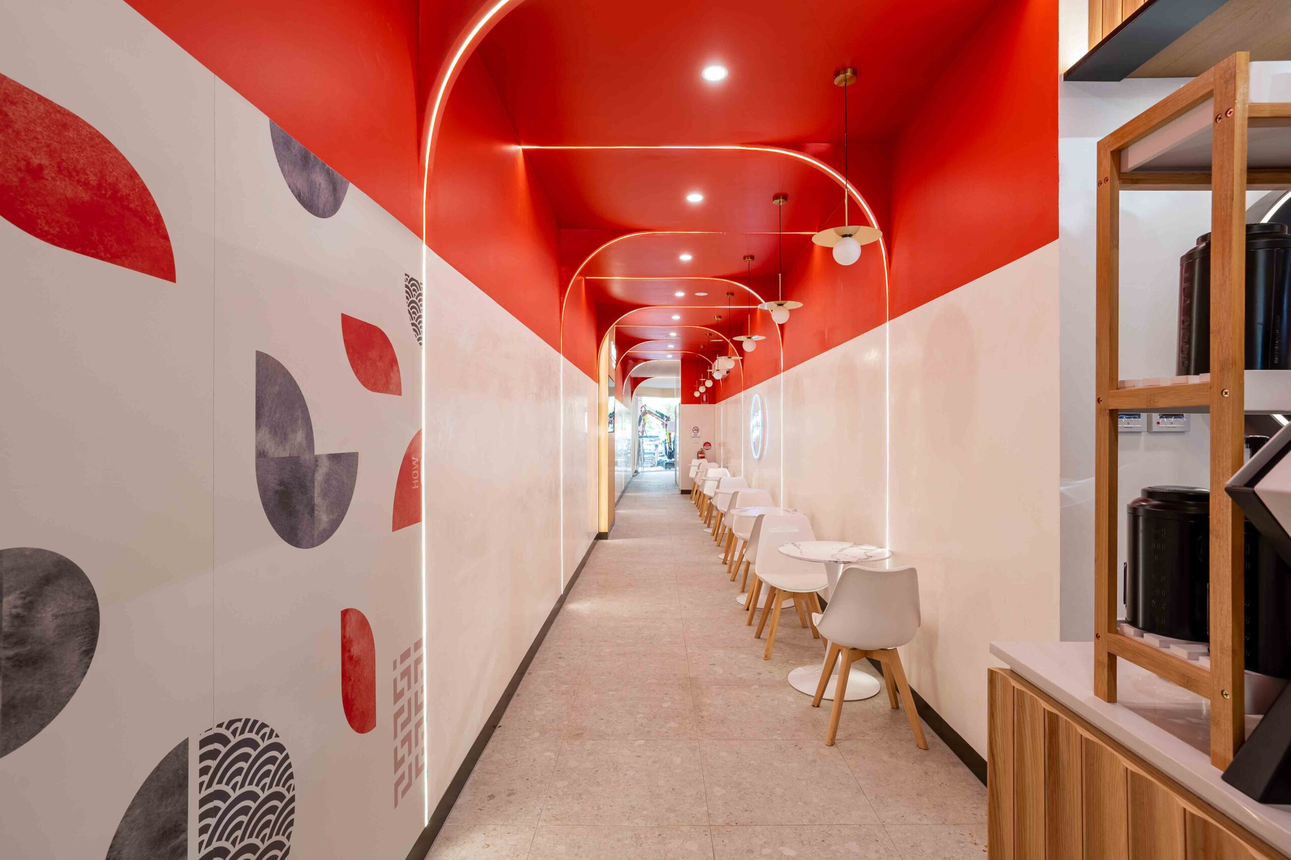 Guided by the brand concept “East Meets West,” the interior balances a warm timber palette with red and white accents to reflect brand identity while maintaining a calm, comfortable atmosphere. The overall intent is to create a welcoming and relaxed environment where customers can browse, select, and enjoy their preferred products with ease.