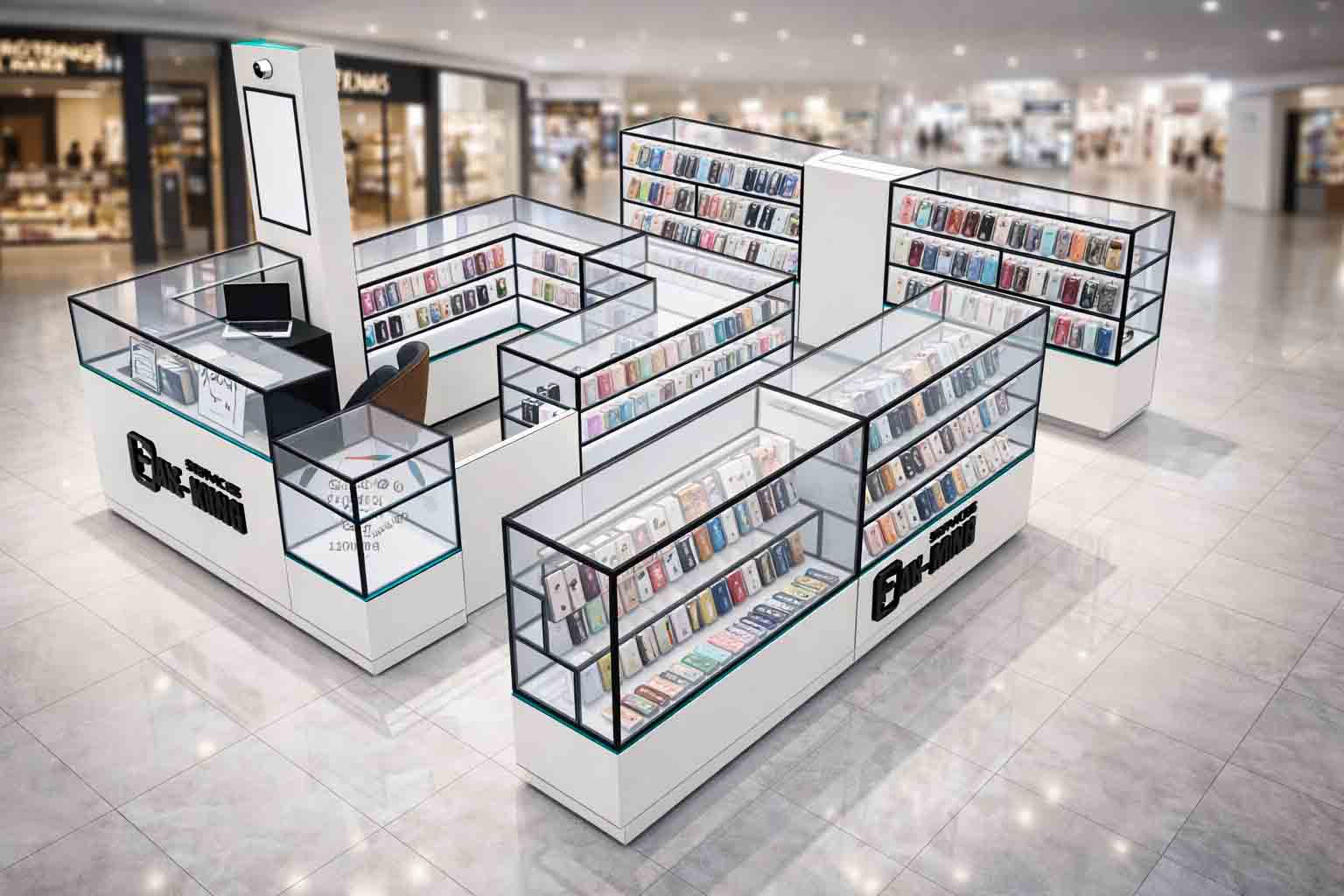 To elevate the overall look, the kiosk is designed with smooth, minimal lines and a clutter-free layout, with integrated storage to keep tools, cables, and stock out of sight. The result is a streamlined customer-facing counter that supports quick service, clear product presentation, and a polished brand image—without competing visually with the vibrant merchandise on display.