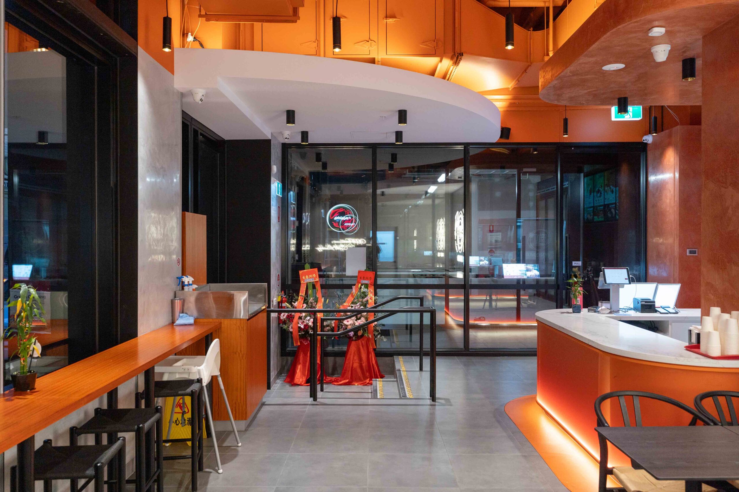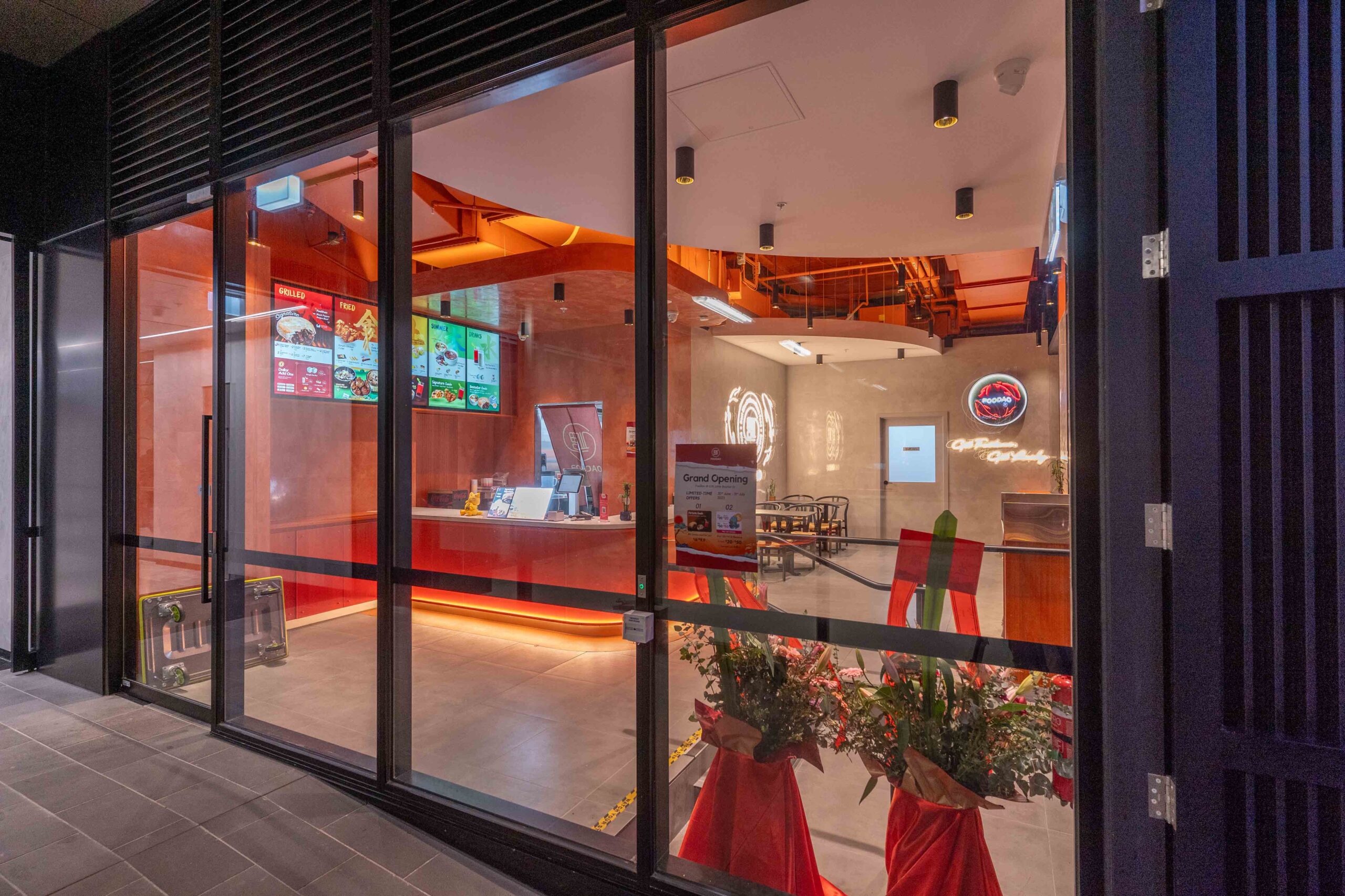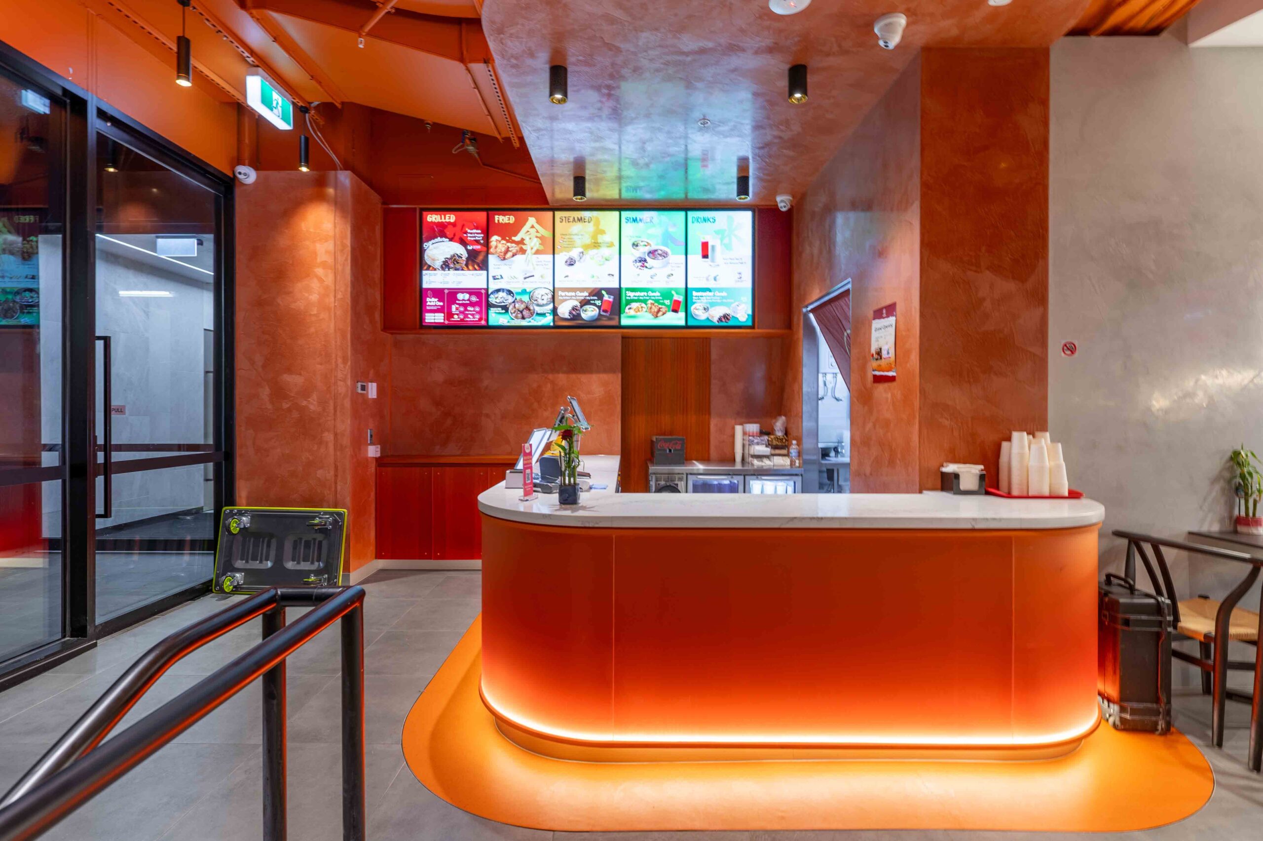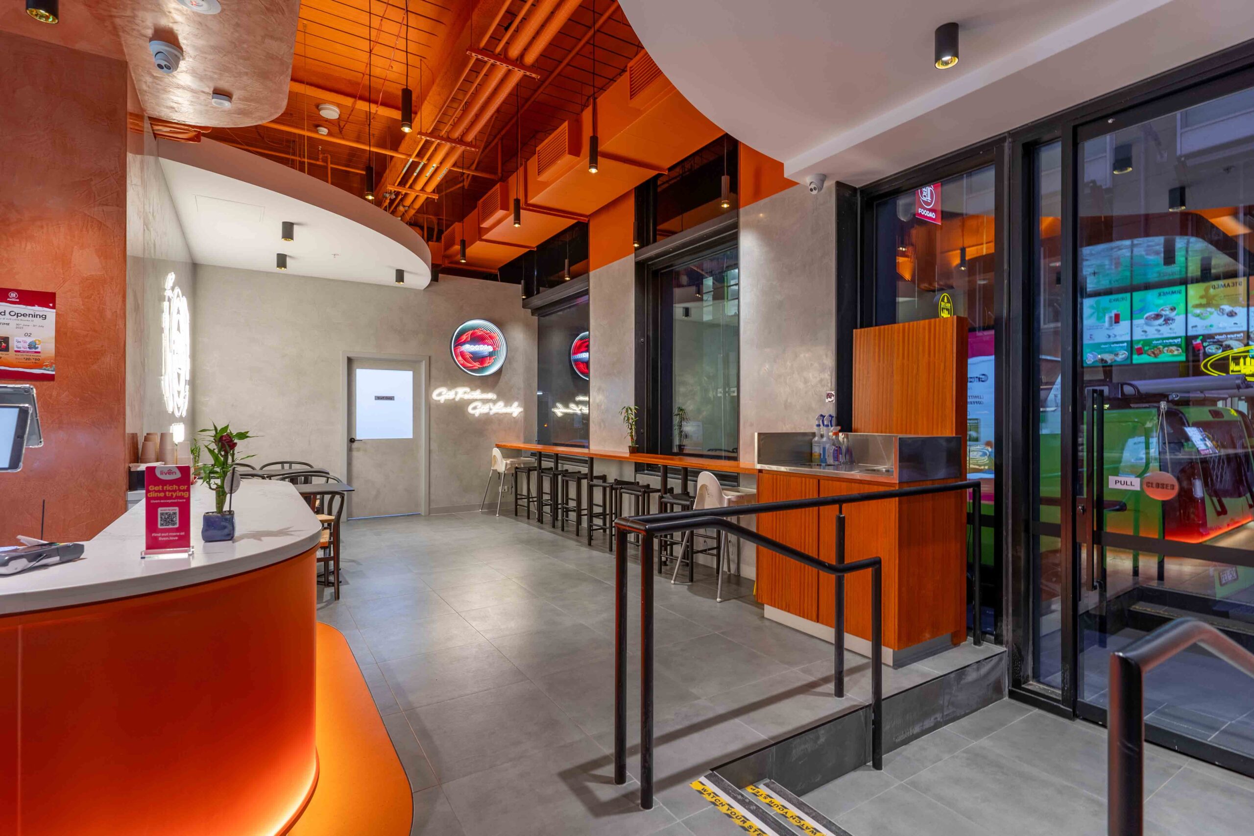 Another new store for Foodao, developed to further evolve the brand’s forward-looking identity. The interior adopts a semi-exposed ceiling strategy, with the entire soffit and services zone sprayed in a bold orange finish to create a unified overhead plane and a strong visual signature.