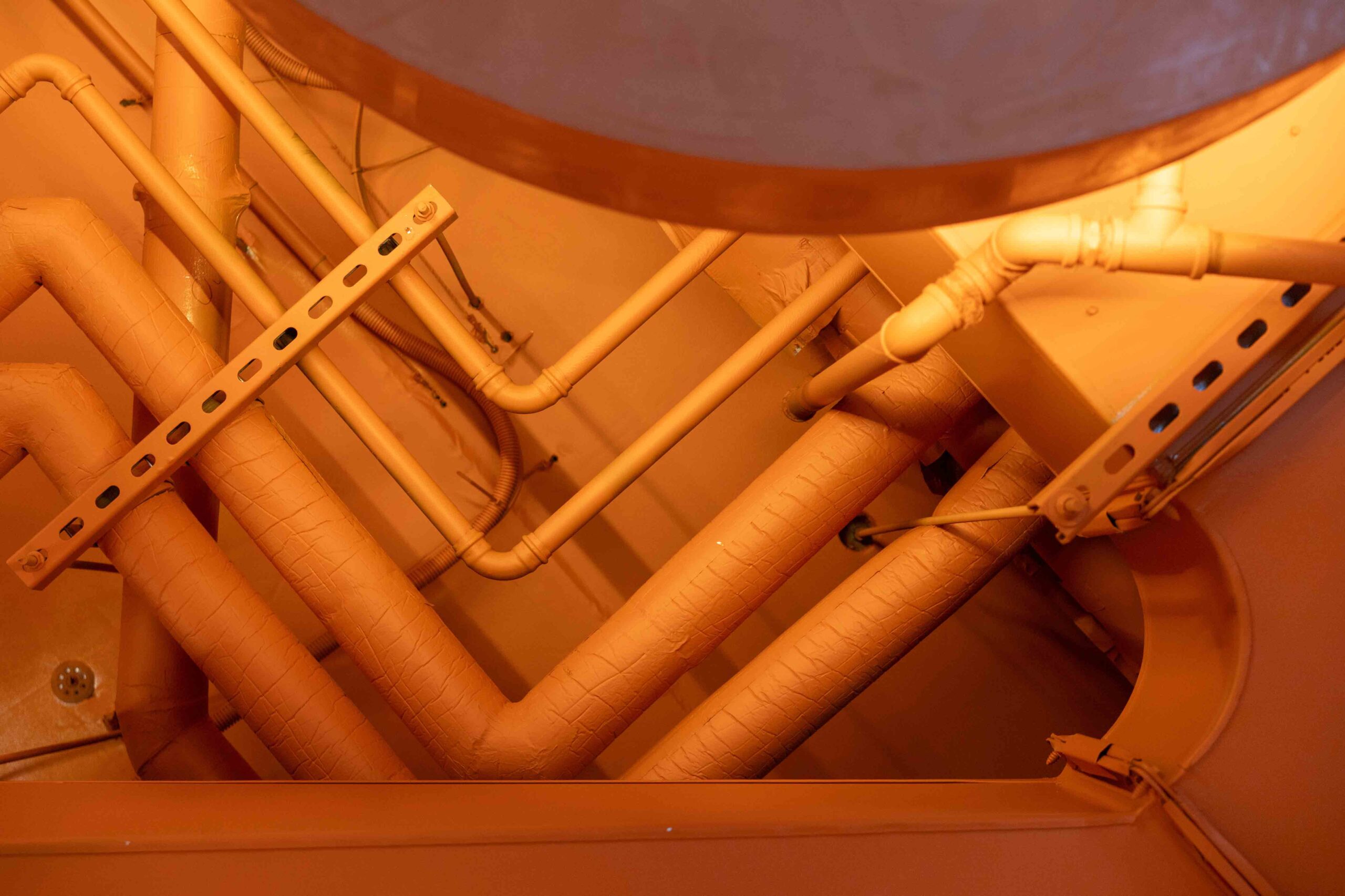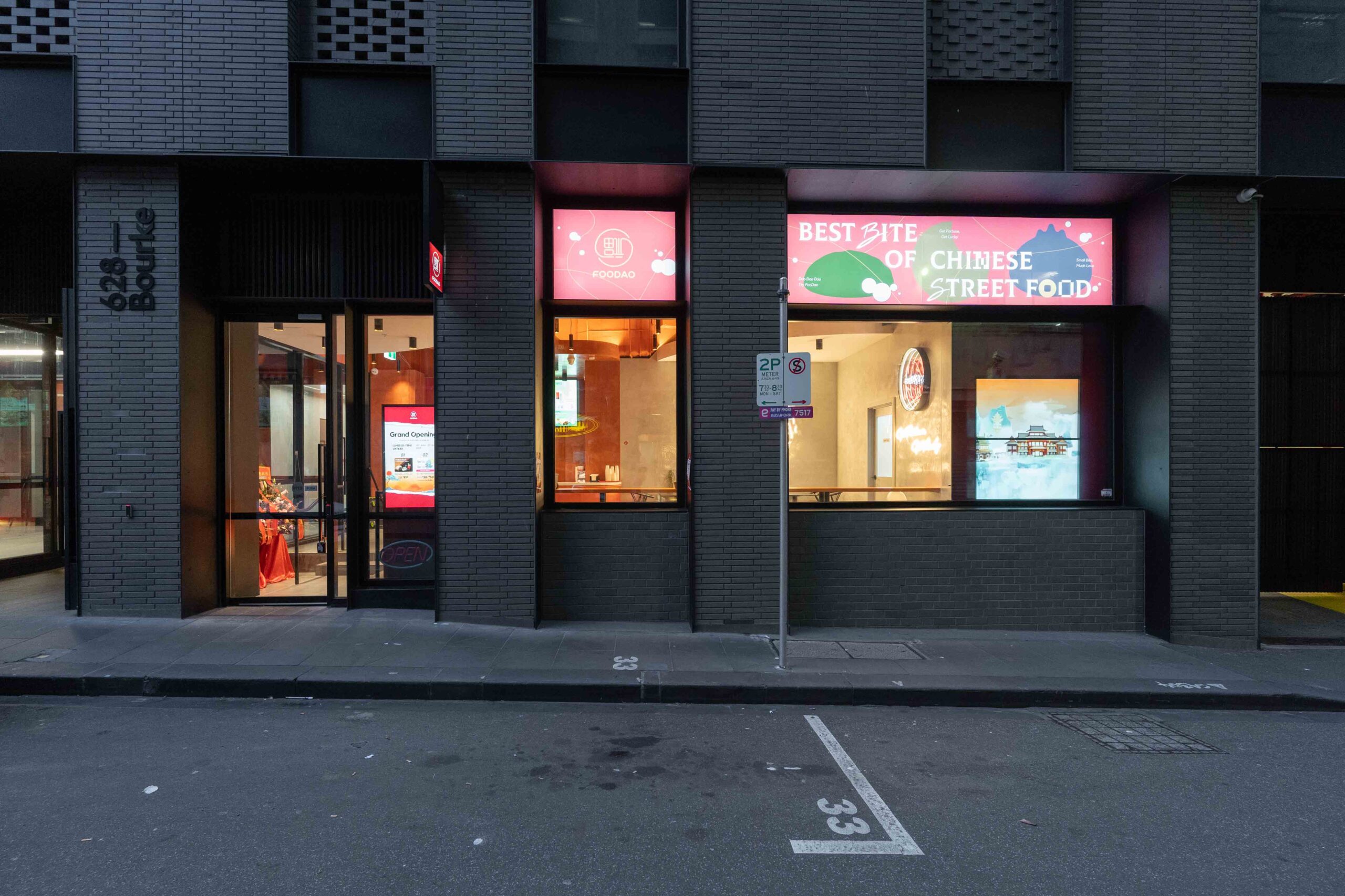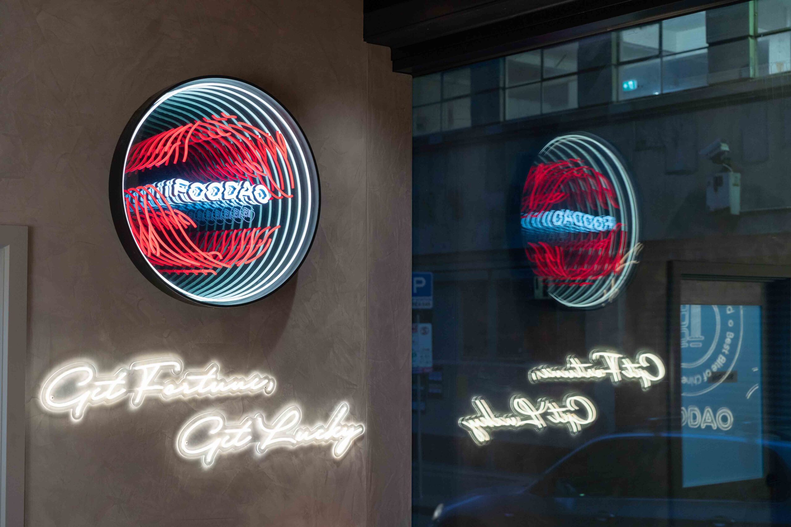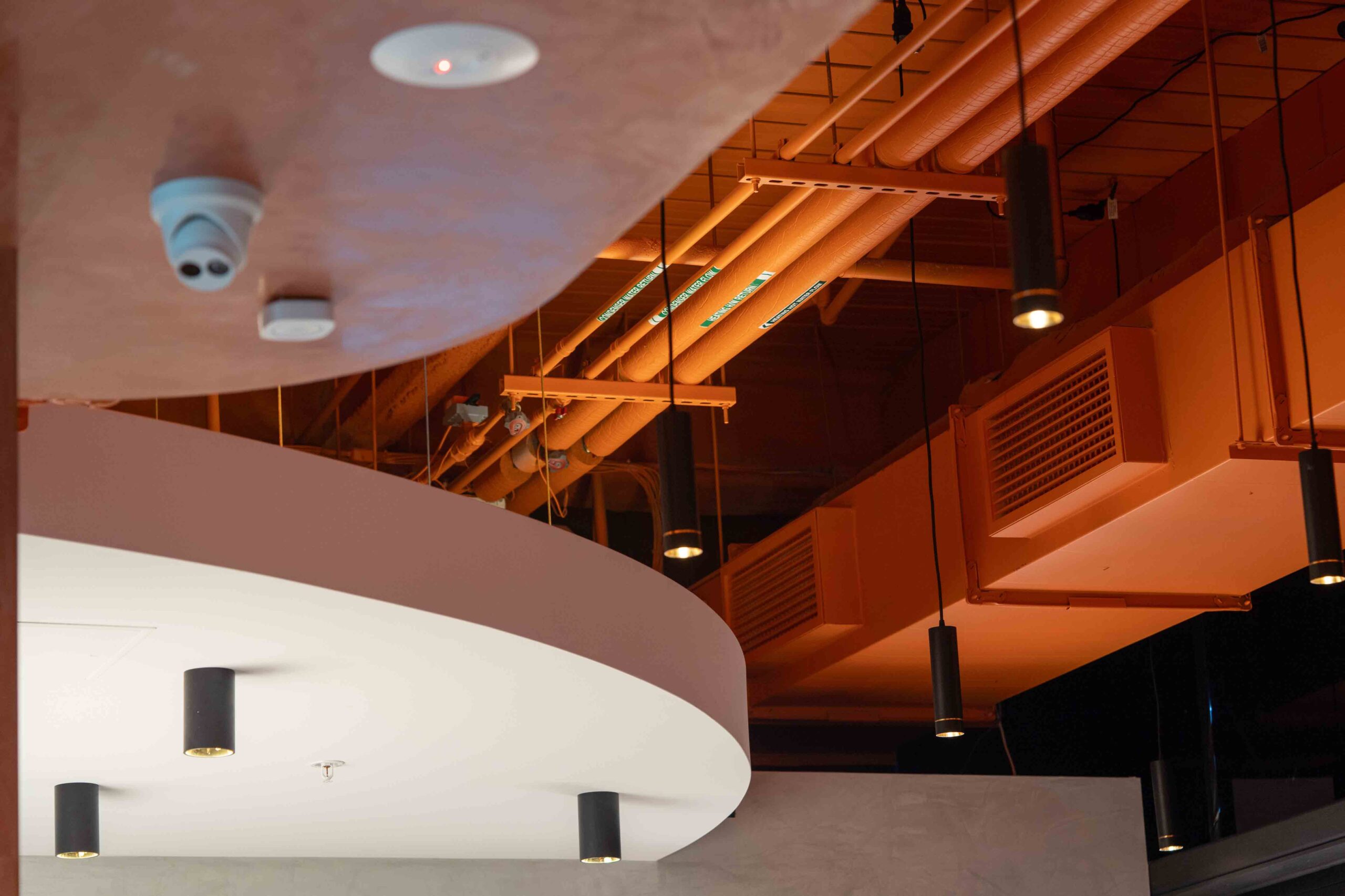 Another new store for Foodao, developed to further evolve the brand’s forward-looking identity. The interior adopts a semi-exposed ceiling strategy, with the entire soffit and services zone sprayed in a bold orange finish to create a unified overhead plane and a strong visual signature.
