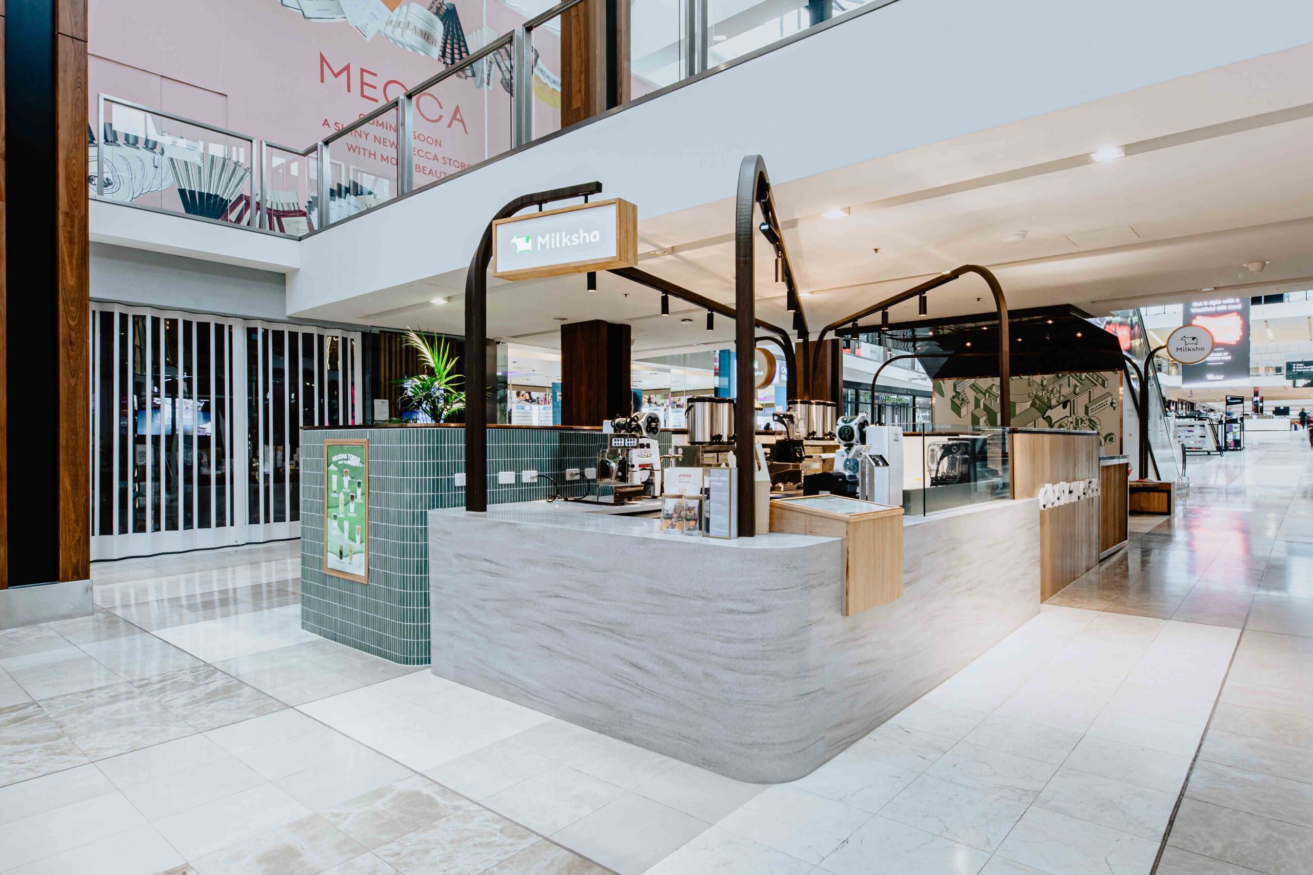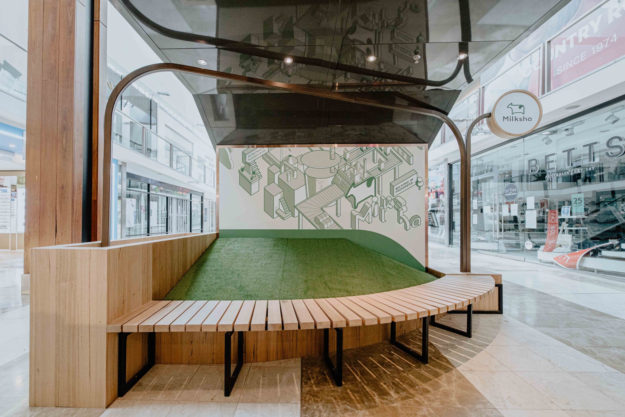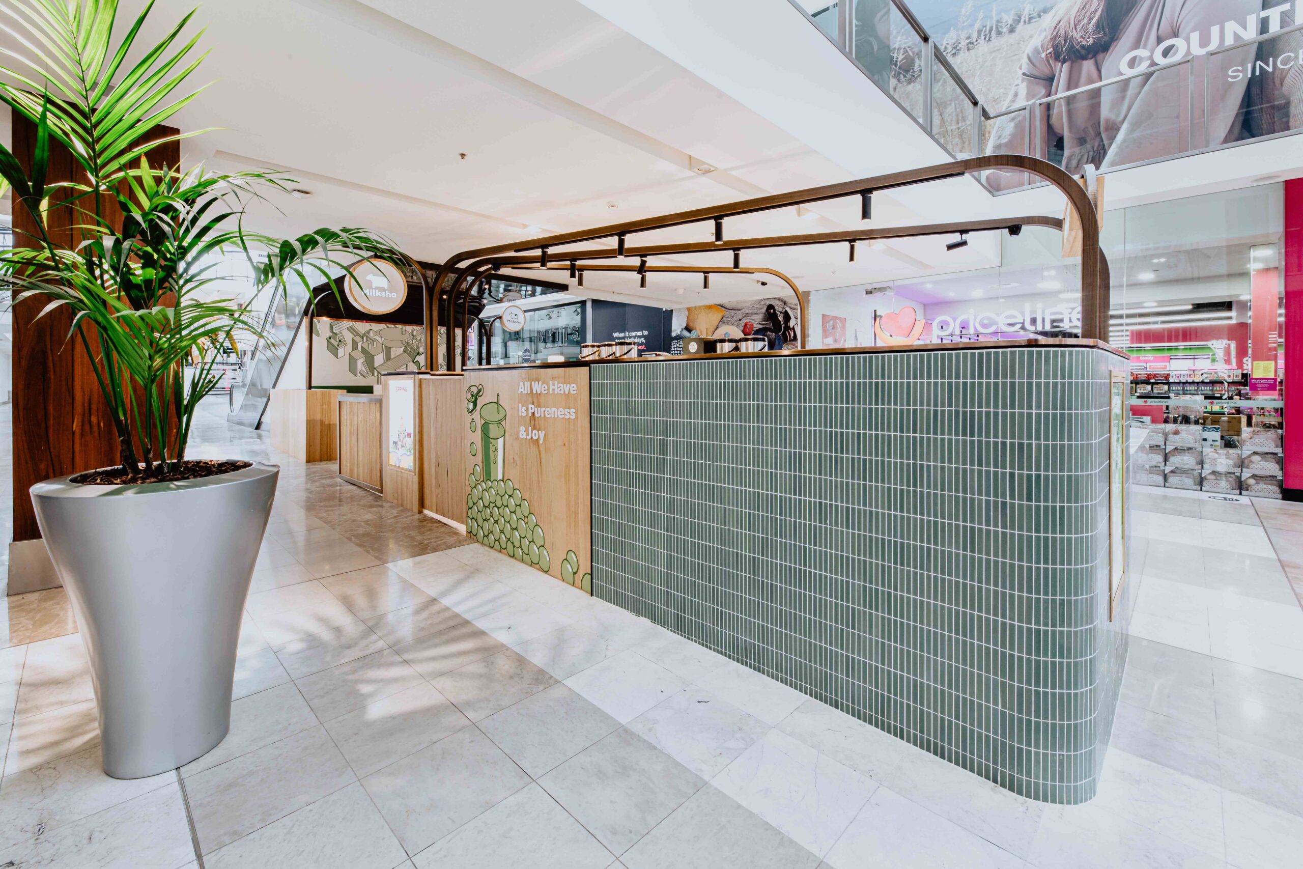 Milksha Doncaster is the second Milksha store in Melbourne. As the brand respects and cares for our environment, the design of kiosk tries to bring natural feeling into the shopping centre. The unique overhead structure together with the Green Japanese Mosaic make it a delicate & modern kiosk. The artificial hill and bench seating under the elevator create an indoor park and invite people passing by to have a rest at the ‘park’. The kiosk now is a new icon meeting place in the shopping mall.