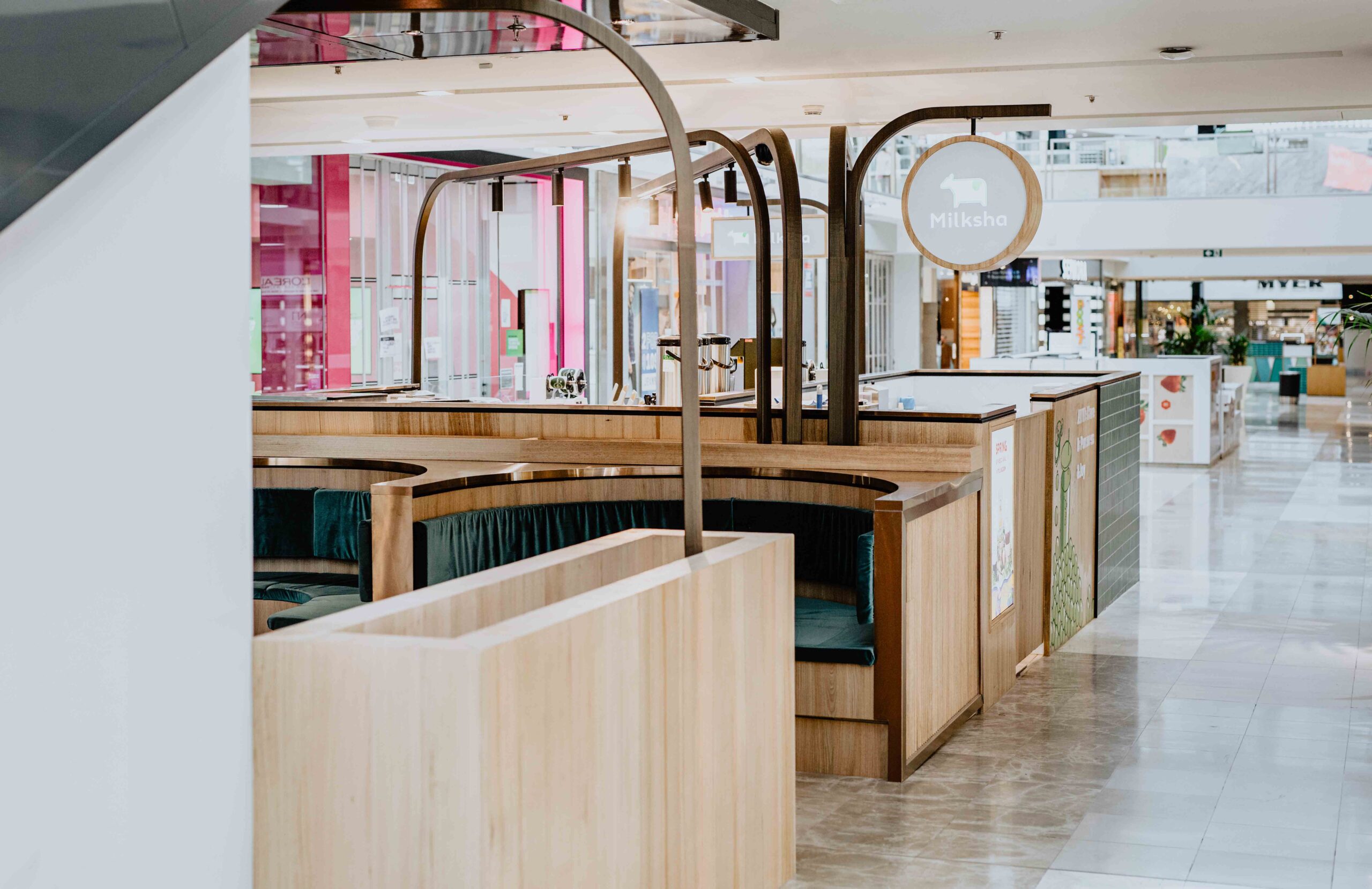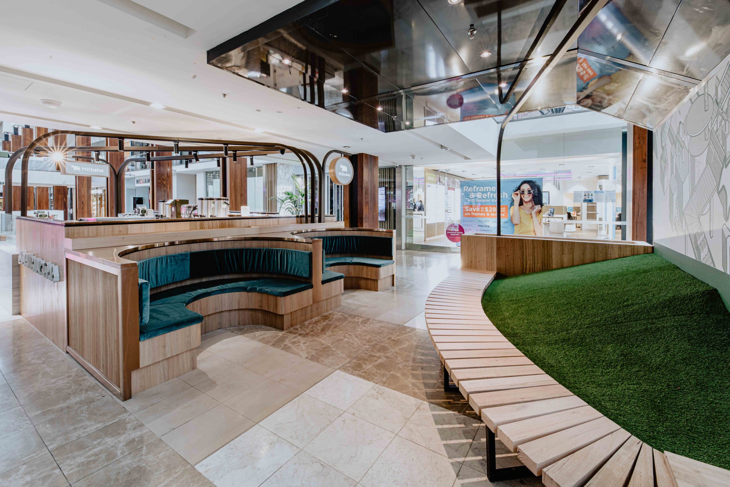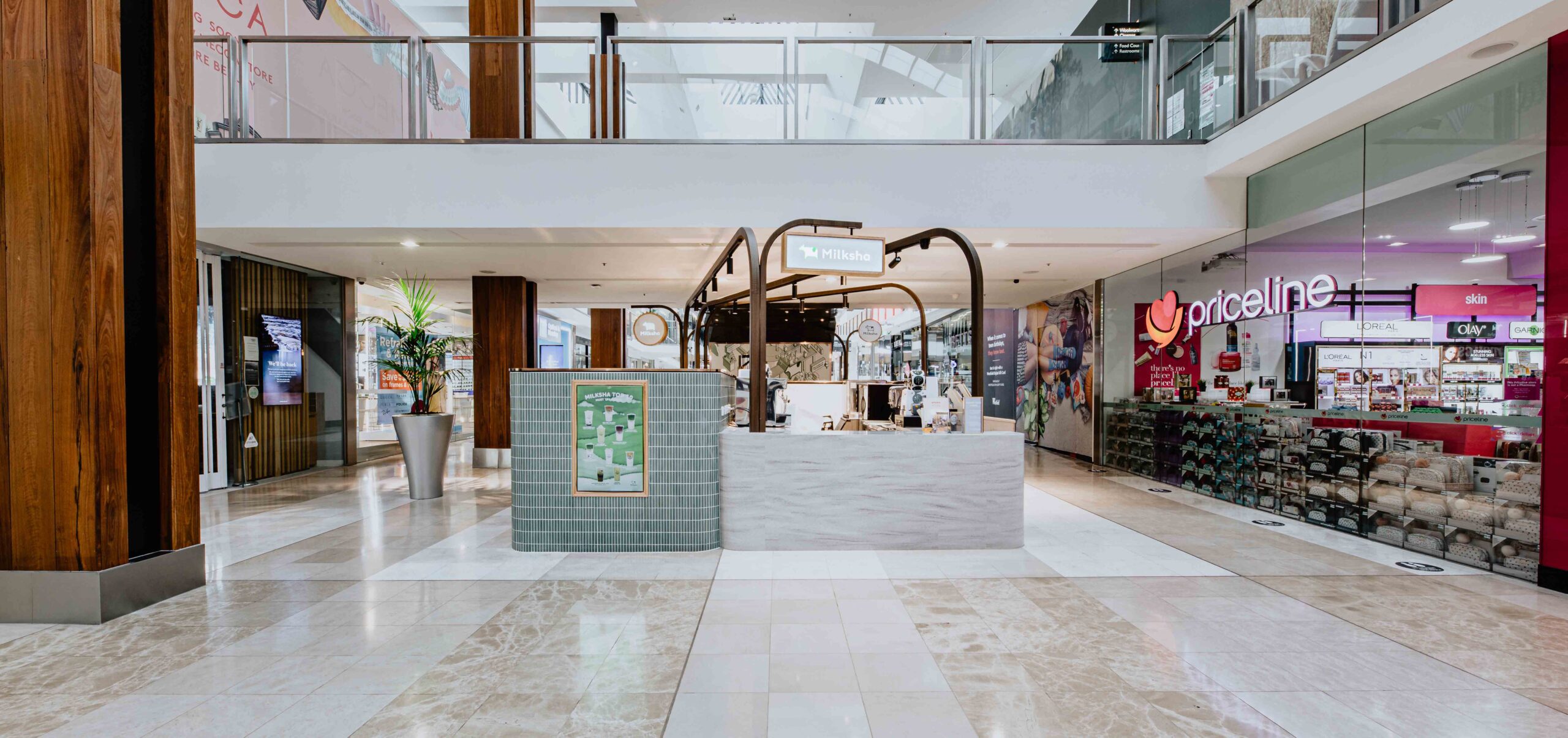 Milksha Doncaster is the second Milksha store in Melbourne. As the brand respects and cares for our environment, the design of kiosk tries to bring natural feeling into the shopping centre. The unique overhead structure together with the Green Japanese Mosaic make it a delicate & modern kiosk. The artificial hill and bench seating under the elevator create an indoor park and invite people passing by to have a rest at the ‘park’. The kiosk now is a new icon meeting place in the shopping mall.